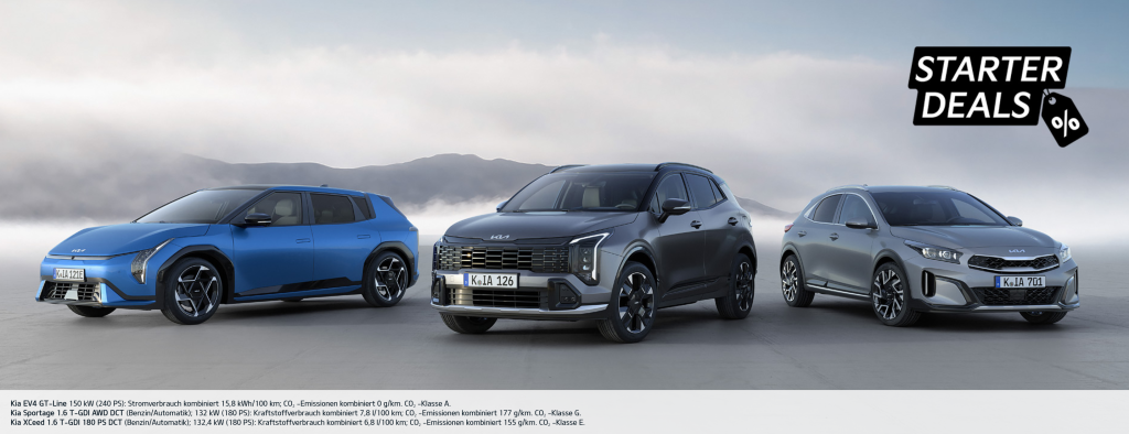 Erlebe jetzt die Kia Starter Deals bis 31.3.2026 und entdecke dein Lieblingsmodell zu besonders attraktiven Leasingkonditionen ohne Anzahlung. Entdecke den Kia EV4, den Kia Sportage oder den Kia XCeed und lass dich inspirieren von modernem Design, innovativer Technik und einem Fahrerlebnis, das Freude macht. Vereinbare am besten direkt einen Termin zur Probefahrt und lass dich begeistern.